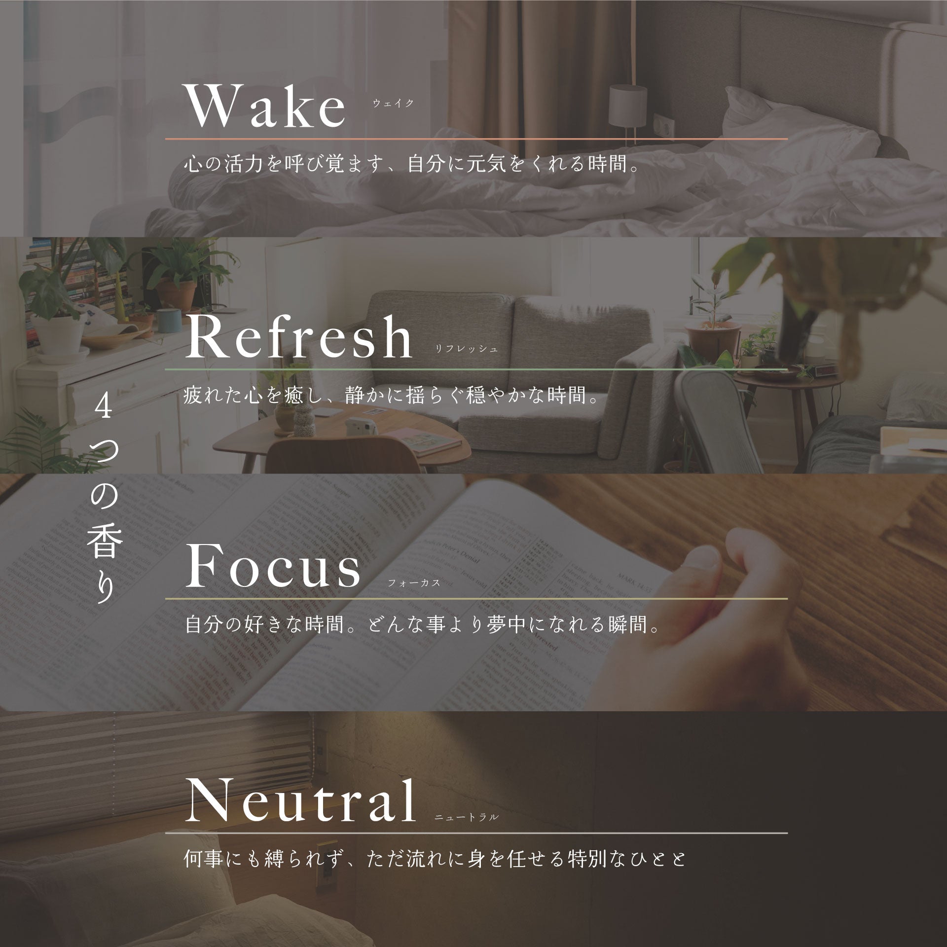 ・Focus…ライムなどの柑橘やユーカリに、ローズやショウガなどの精油をブレンド。スッキリとした中にも上品さを感じられる香り。